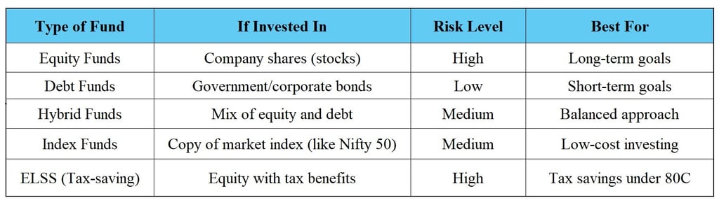 A mutual fund collects money from many people and invests it in different financial instruments like company shares, government bonds, or gold.